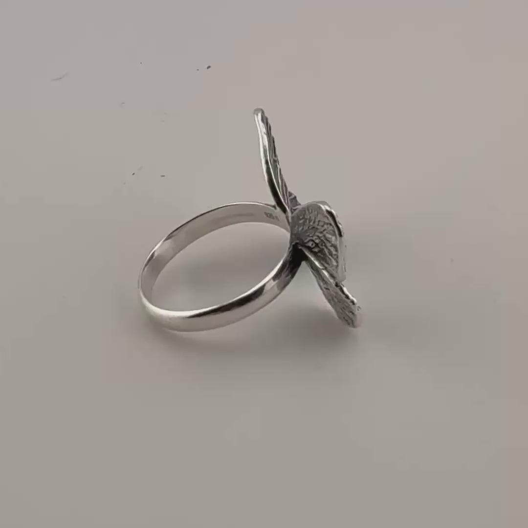 Cast in sterling silver, the open band curves around the finger with two detailed wing forms facing one another, their veining and texture rendered with care rather than polish. The shape feels more like an impression than an illustration — natural, dimensional, and thoughtfully restrained. It arrives sized to a 7 and is designed to be adjustable, gently shaped to fit your finger as needed. To preserve the integrity of the band, we recommend adjusting it only once.