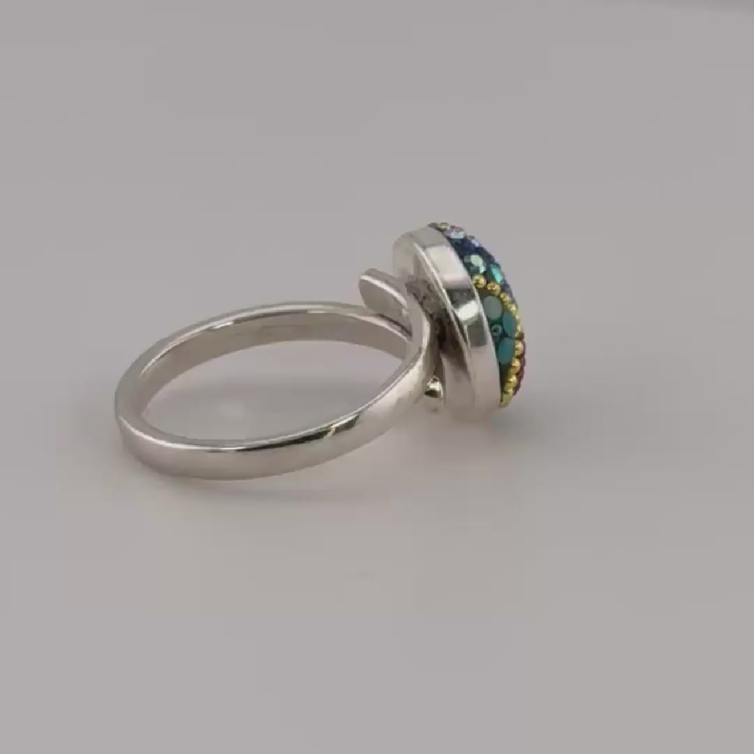 Each ring is handmade in Guadalajara, Mexico. The base is sterling silver with an adjustable band, and the face is set with epoxy clay, then layered with hand-placed crystals in that wild and joyful Mosaico style.